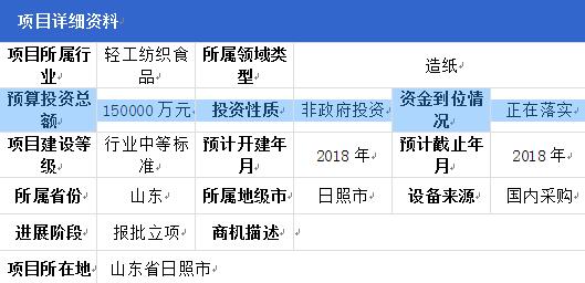 山東年產150萬噸包裝紙(二期)項目,該項目位于山東省日照市。項目總占地面積500畝,項目三期:二期占地面積200畝。項目總投資150000萬元。