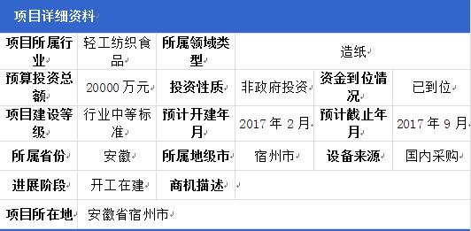 安徽年產10萬噸秸稈清潔制漿造紙綜合利用改擴建(一期)項目,該項目位于安徽省宿州市。項目一期建設年產5萬噸秸稈清潔制漿生產線。項目總占地面積17.8213公頃;項目建成年產10萬噸秸稈清潔制漿生產線,其中3萬噸紙漿外售,新建4萬噸高檔環保生活用紙生產線,替代原有東風造紙廠3萬噸廢紙制漿造紙生產線。項目一期投資20000萬元,總投資40000萬元。