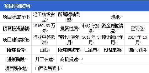 山西年產12萬噸環保石頭紙項目,該項目位于山西省呂梁市。項目包裝裝飾環保類用紙3.5萬噸/年、新聞類用紙1.5萬噸/年、生活類用紙2萬噸/年、文化類用紙1.5萬噸/年、銅板類質3.5萬噸/年。項目總投資18169.63萬元。