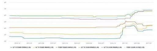 白卡紙方面:2016年年底拉升之前,價格徘徊于5600元/噸上下,截至2017年7月中旬,已漲到6900元/噸上方,漲幅超過20%。