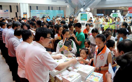 活動當日恰逢天降甘露,但絲毫擋不住讀者們的熱情,很多讀者提前1個多小時就來排隊,很快日照江和圖書館的大廳里就人頭攢動,聚集了上千人。亞太森博的志愿者們也早早趕到現場忙碌起來,有的布置現場,有的維持秩序,有的搬運書籍,有的向到場的市民朋友介紹活動內容,整個現場熱鬧而溫馨。