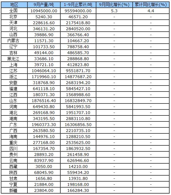 1-9月全國機制紙及紙板產(chǎn)量9559.4萬噸