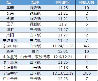 年底,迎來了白卡紙、雙膠紙和銅版紙主流廠商停機檢修期,預計減少市場供給25萬噸左右。