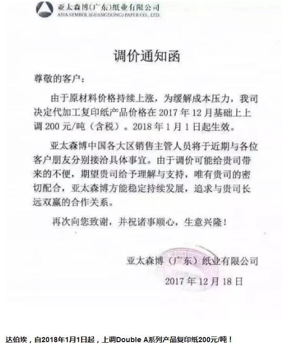 亞太森博,自2018年1月1日起,上調加工復印紙產品200元/噸!