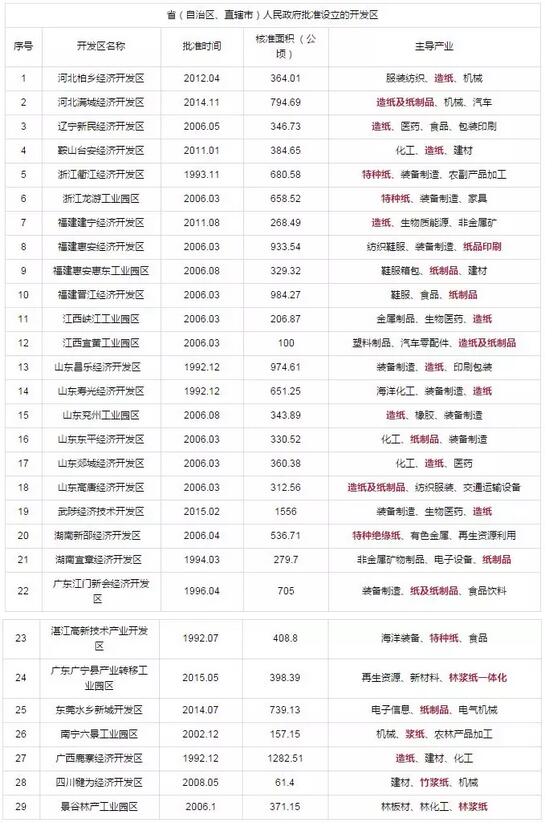 省(自治區、直轄市)人民政府批準設立的省級開發區,主導產業中有造紙、紙制品行業的共有29個: 河北省2個; 遼寧省2個; 浙江省2個; 福建省4個; 江西省2個; 山東省6個; 河南省1個; 湖南省2個; 廣東省4個; 廣西自治區2個; 四川省1個; 云南省1個。