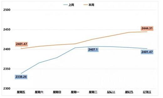 圖1-1本周價格漲跌情況 近期廢紙大盤趨穩 指數顯示,本期(4月4日至4月22日)廢紙價格大盤趨于穩定。 本周廢紙價格指數均值為2422.52,較上周的2388.17上調34.35。短期來看,本周廢紙價格一路上漲,根據紙去哪了指數顯示,上周跌勢不明顯,持續至上周五(4月13日)跌至最低點2401.47。