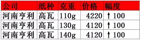 說明:表格中價(jià)格指到廠價(jià)或自提價(jià),僅供參考。 河南亨利紙業(yè)、新亞紙業(yè):瓦楞紙價(jià)格上調(diào)50-100元/噸 而河南的中小紙廠沉寂了一小段時(shí)間后,當(dāng)前又開始小幅提價(jià)。據(jù)華印小編調(diào)查得知,自4月16日起,河南亨利紙業(yè)部分高強(qiáng)瓦楞紙價(jià)格上漲100元/噸。目前公司110-140g高瓦價(jià)格在4120-4220元/噸左右。河南新鄉(xiāng)新亞紙業(yè)集團(tuán)80g瓦楞原紙?zhí)醿r(jià)50元/噸,目前在醞釀繼續(xù)提價(jià)。