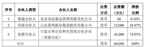 據悉,該投資基金總規模為人民幣6億元,其中:央創基金作為普通合伙人及基金管理人認繳人民幣60萬元,約占全體合伙人認繳出資額的0.10%;晨鳴紙業作為有限合伙人認繳人民幣1.5億元,約占全體合伙人認繳出資額的24.97%;寧波正和作為有限合伙人認繳人民幣4.5億元,約占全體合伙人認繳出資額的74.93%。