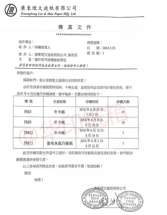 破天荒!又一造紙巨頭廣東理文造紙有限公司5月23日對外宣布4臺紙機停機檢修7-15天不等。在年中造紙巨頭理文停機檢修是史無前例的。繼今年湖北榮成、東莞建暉及福建聯盛短暫停機或停單后,又一造紙巨頭加入停機檢修行列,主要原因皆因進口廢紙原料短缺所致。如今進口廢紙受政策原因將持續供不應求,下一個突然宣傳停機檢修的又會是誰呢? 理文4臺紙機停機檢修,涉及?埣巴坎蓟业装装寮