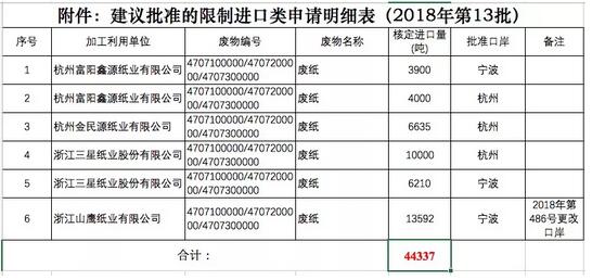 5月29日,環(huán)保部固廢中心發(fā)布第十三批建議批準(zhǔn)的限制進口類申請明細(xì)表,這一批次共有4家造紙企業(yè)獲得進口許可,其中浙江山鷹為為原許可證(第二批)更換口岸,實際核準(zhǔn)的新增量僅為3.0745萬噸。