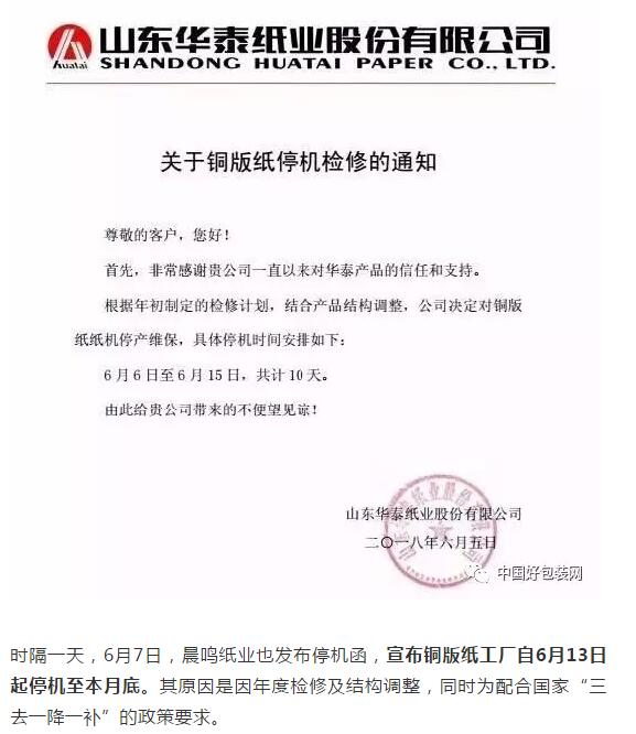 6月5日,華泰紙業(yè)發(fā)布停機(jī)通知,宣稱根據(jù)年初制定的檢修計劃,結(jié)合產(chǎn)品結(jié)構(gòu)調(diào)整,公司決定對銅版紙紙機(jī)停產(chǎn)維保:6月6日至6月15日停機(jī)10天。