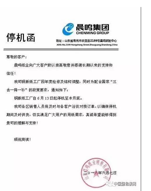 時隔一天,6月7日,晨鳴紙業(yè)也發(fā)布停機(jī)函,宣布銅版紙工廠自6月13日起停機(jī)至本月底。其原因是因年度檢修及結(jié)構(gòu)調(diào)整,同時為配合國家“三去一降一補(bǔ)”的政策要求。