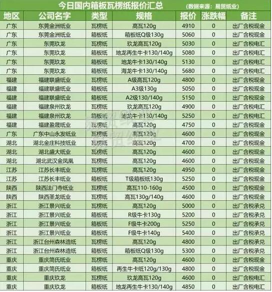 (7月7日紙廠報價情況) 以下為7省16家紙廠報價情況。值得注意的是,由于市場變化太快,具體價格請以廠家實際報價為準,以下僅供參考: 江蘇 江蘇長豐紙業:高瓦120g報價4950元/噸,T級箱板紙130g報價5250元/噸(出廠含稅現金)。 陜西 陜西法門寺紙業:高瓦110-160g報價4500元/噸(出廠含稅現金)。 陜西圣龍紙業:高瓦130g/140g報價4600元/噸(出廠含稅現金)。 浙江 浙江景興紙業:高瓦120g報價5000元/噸,R級牛卡130g報價5200元/噸,F級牛卡200g報價5250元/噸,F級牛卡140g報價5400元/噸(出廠含稅承兌)。 浙江臺州森林造紙:高瓦120g報價4800元/噸,箱板紙Q級130g報價5300元/噸(出廠含稅承兌)。 重慶 重慶簡氏紙業:高瓦120g報價4600元/噸,再生牛卡紙120g/130g報價4800元/噸(出廠含稅現金)。 重慶玖龍紙業:玖龍高瓦120g報價4600元/噸,地龍再生牛卡130/140g報價4850元/噸(出廠含稅電匯)。 湖北 湖北金莊科技紙業:高瓦120g報價4700元/噸(出廠含稅現金)。 湖北盛大紙業:高瓦120g報價4600元/噸(出廠含稅現金)。 湖北武漢金鳳凰:高瓦120g報價4600元/噸(出廠含稅現金)。 廣東 東莞金洲紙業:7月7日高瓦120g報價4910元/噸,箱板紙Q級130g報價5060元/噸(出廠含稅現金)。 東莞玖龍紙業:玖龍高瓦120g報價5030元/噸,地龍再生牛卡130/140g報價5080元/噸,地龍牛卡130/140g報價5130元/噸,海龍牛卡130/140g報價5680元/噸(出廠含稅電匯)。 廣東中山永發紙業:高瓦120g報價4600元/噸(出廠含稅現金)。 福建 福建聯盛紙業:A級高瓦120g報價4800元/噸,箱板紙A3級130g報價5050元/噸,箱板紙A2級130/140g報價5150元/噸(出廠含稅現金)。 福建泉州玖龍:玖龍高瓦120g報價4900元/噸,地龍牛卡130/140g報價5250元/噸(出廠含稅電匯)。 福建盈晟紙業:高瓦120g報價4750元/噸(出廠含稅現金)。