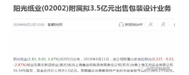 陽(yáng)光紙業(yè)6月份曾公告,將以3.5億出售上海王的實(shí)業(yè) 據(jù)了解,在6月12日,陽(yáng)光紙業(yè)曾公告,上海魯達(dá)紙制品擬向山東世紀(jì)陽(yáng)光紙業(yè)(公司持有99.9%)及昌樂新邁紙業(yè)(公司持有100%)購(gòu)買上海王的實(shí)業(yè)96.54%股權(quán),現(xiàn)金總代價(jià)人民幣3.5億元。