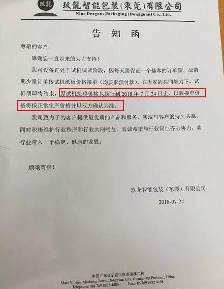 為此,7月19日,珠三角紙板廠協會(籌)發出《倡議書》,用生動詳細的語言分析了二級紙板廠的成本及目前面臨的困境,號召同行攜手維護市場秩序。詳見:一級紙廠超低價搶訂單,紙板協會怒發倡議書,不做“待宰羔羊”。 時隔三日,7月22日,玖龍高層正面與珠三角紙板廠協會(籌)直接溝通,認同協會對維護行業正常合理的利益所做的努力,表示愿共同維護正常有序的競爭環境。 7月24日,玖龍包裝發出最新告知函,表示:原試機接單價格只執行到2018年7月24日止,以后接單按正常生產價格并以雙方確認為準。