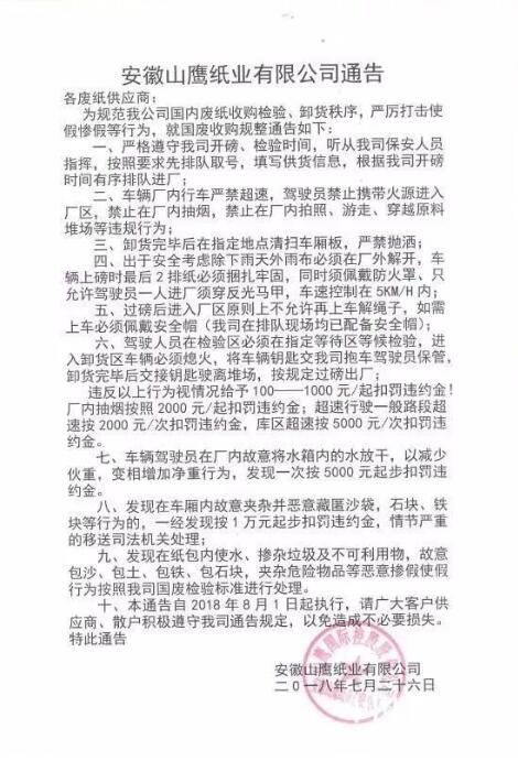 圖片來源于99廢紙網 不過,作為一個自由化程度相對較高的市場,紙價走勢總體上還是由市場供需決定的!這不,漲聲未落,珠三角廢紙價格又不爭氣地下跌了。 【易跌難漲】 珠三角國廢再次下跌 如果說2016年的紙價瘋漲的發起點是靠雙十一需求外,2017與2018年的瘋漲則基本上靠龍頭的集體拉抬,環保關停的助力和市場投機心理。 特別是到了2018年,受到產能擴張和需求萎縮的雙重影響,即便不算可能高達千萬噸的存量,包裝紙的生產也已經明顯供大于求。因此,我們就不難理解為什么紙價為何易跌難漲的原因了。 這不,市場漲聲未落,國廢就已經掉頭向下! 【金洲紙業】 7月31日起降50元 一級紙2800 (一級紙為純工廠紙邊、純工廠紙、大煙箱紙、純黃紙皮、商場黃紙) 二級紙2700(黃紙花紙比例80/20); 三級紙2600(花紙比例20%-50%); 特此通知! 【東莞玖龍紙業】 7月31日起,黃紙皮下調80元每噸,白廢紙不變,廢紙到廠價格如下: (1)A級:2900元/噸(下調80元); (2)B級:2850元/噸(下調80元); (3)C級:2800元/噸(下調80元); (4)D級:2550元/噸(下調80元); (5)坑紙:2550元/噸(下調80元); 其它不變 【安徽山鷹紙業】