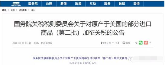 已經(jīng)持續(xù)一段時(shí)間的中美貿(mào)易戰(zhàn)又生變化,中國(guó)方面逐步反擊。8月3日,財(cái)政部網(wǎng)站發(fā)布了《國(guó)務(wù)院關(guān)稅稅則委員會(huì)關(guān)于對(duì)原產(chǎn)于美國(guó)的部分進(jìn)口商品(第二批)加征關(guān)稅的公告》,用以反擊此前美國(guó)對(duì)中國(guó)2000億美元商品加征25%關(guān)稅的措施。  反擊!中國(guó)對(duì)原產(chǎn)于美國(guó)的5207個(gè)稅目進(jìn)口商品加征關(guān)稅,涉及貿(mào)易額600億 2018年8月3日,財(cái)政部發(fā)出通知《國(guó)務(wù)院關(guān)稅稅則委員會(huì)關(guān)于對(duì)原產(chǎn)于美國(guó)的部分進(jìn)口商品(第二批)加征關(guān)稅的公告》,全文如下: