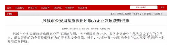 7月26日下午,鳳城市福祥紙業有限公司負責人將一面印有“維護營商環境,護航企業發展”的錦旗送到藍旗派出所,對藍旗派出所對企業給予的大力支持和幫助表示感謝。