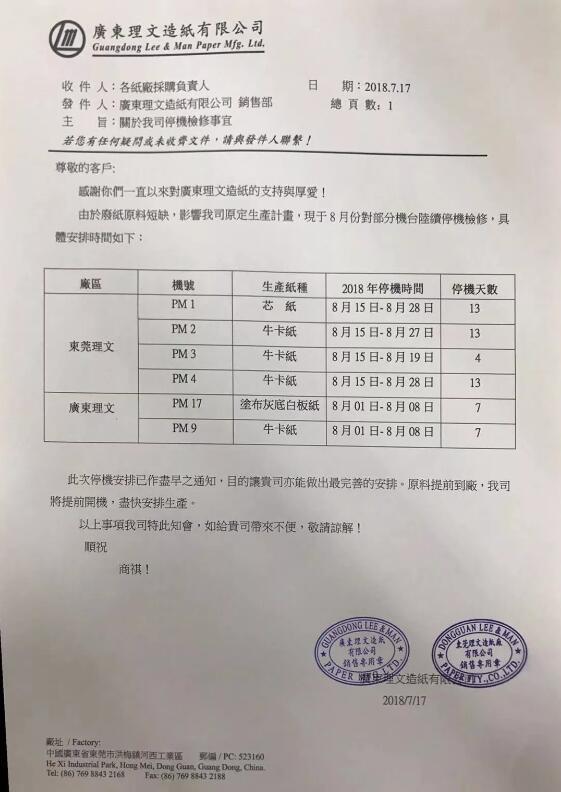 理文廣東、東莞、江蘇、重慶、江西5大基地漲價 8月9日,廣東理文、東莞理文、江蘇理文、重慶理文、江西理文突然對外宣布上調紙價,幅度在100-200元/噸,涉及的紙種暫只有牛卡紙。 據南方一家規模紙板廠透露:以東莞理文為例,8月9日優質牛卡價格上調200元/噸后,牛卡H126g含稅到廠價5935元/噸;H160g含稅到廠價5805元/噸,H200-230g含稅到廠價5755元/噸。 在7月31日的中期業績發布會上,理文造紙首席執行官李文斌談及下半年紙價走勢時就曾釋放漲價信號。他表示,下半年為傳統消費旺季,對公司的產品需求將增加;而國家收緊環保政策則令供應構成壓力,故料下半年整體紙價仍有上升的空間,對公司收益有利。不過,紙價不會無止境地上升,因高昂的紙價或令客戶轉用其他物料代替。 漲價導火索:中方宣布對美廢加征25%關稅 近期由于下游需求無較大起色,包裝紙價格一直低迷。就在8月8日廣東、福建還有好幾家龍頭紙廠降價,周邊部分中小紙企跟跌100-200元/噸,且多數紙廠實單成交時還有優惠。“9號關稅清單一出來,我就猜到要漲價,但沒想到龍頭反應這么快!”多家紙板廠老板在采訪中向華印小編吐槽。 根據他們分析,按照往年慣例,理文造紙應該會選擇在8月中下旬各紙機均從停機檢修中恢復生產后,才會提價。但這次卻剛開始停機幾天,就突然漲價,漲的讓人措手不及,沒有一點點防備。