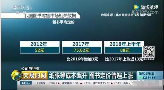 圖書漲幅增速明顯增加,但仍不能緩解出版社壓力 “開卷信息”發布的《2018上半年中國圖書零售市場趨勢和特點》)報告顯示,2012年新書平均定價52元,2017年新書平均定價75.62元,比2016年增加3元。2018年上半年,新書平均定價88元,在2017年的水平上上漲近13元,漲幅增速明顯增加。