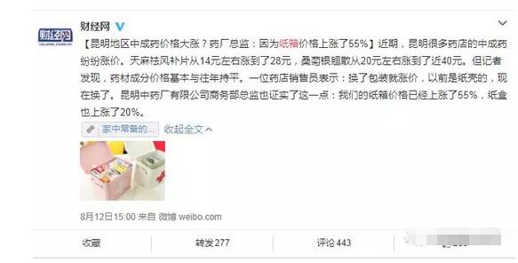8月12日,知名財經媒體在新浪微博上稱:昆明地區中成藥價格大漲?藥廠總監:因為紙箱價格上漲了55%。