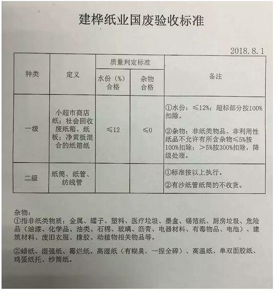 東莞建樺紙業(yè) 8月1日起,執(zhí)行廢紙回收新標(biāo)準(zhǔn),要求水分不能超過12%,雜物不得超過0%。