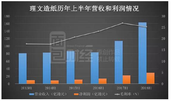 早在此次中期業(yè)績披露之前,理文造紙的股價已經(jīng)經(jīng)歷一波大跌:從2018年5月中旬的9.58港元一路跌至7月中旬的6.46港元,2個月時間跌幅達32.57%,隨后股價才開始回調(diào)。 事實上,可以看到理文造紙的這場大跌趨勢最早要追溯到2017年的9月中旬,按當(dāng)時最高復(fù)權(quán)股價10.71港元來算,至今年7月中旬已經(jīng)下跌近40%。 那么,理文造紙在這近一年里到底發(fā)生了什么?是什么讓市場對其靚麗業(yè)績不買賬?先來看最新的中報業(yè)績。 業(yè)績速讀:營收利潤雙雙創(chuàng)新高,毛利率5年來首次下滑 根據(jù)理文造紙中報披露,今年上半年共銷售產(chǎn)品295萬噸,同比增長6.5%,每噸利潤為1009港元,同比增長27.4%,紙品利潤單價創(chuàng)下新高。今年上半年,理文造紙的營收和凈利潤也都創(chuàng)下歷史新高: