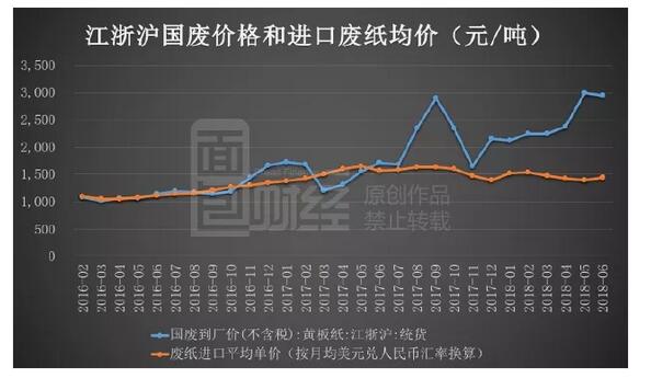 今年上半年,理文造紙營收為163.7億港元,同比增長43.1%;凈利潤為29.8億港元,同比增長35.9%。不僅絕對值都創(chuàng)新高,同比增幅也都是近五年來最高。 但是,值得注意的是,理文造紙的中期毛利率卻迎來2014年以來的首次下滑:從去年上半年的26.91%降至今年上半年的25.18%,減少了1.73個百分點。毛利率的下滑,可能正是市場擔(dān)憂的地方。 造紙廠的毛利率主要由兩方面決定:一個是紙品的出廠價,另一個是原材料的采購價格。而這兩端的價格在過去一年多漲幅迅猛,尤其是原材料價格的飛漲,讓市場對其未來的利潤產(chǎn)生擔(dān)憂。而今年美國掀起貿(mào)易戰(zhàn)后,擔(dān)憂更甚。 美廢價格將上揚,國廢供應(yīng)能否跟上? 近年來我國一直在開展對“洋垃圾”的打擊。 2017年8月,相關(guān)文件出臺,將從2017年底開始正式禁止進口未經(jīng)分揀廢紙。2018年3月,廢紙進口新規(guī)正式開始實施,新規(guī)要求申請進口廢紙許可的企業(yè),年產(chǎn)能需達到5萬噸,且將進口廢紙含雜率從1.5%降至0.5%。 在對進口廢紙的多重限制下,國內(nèi)紙廠將原材料采購轉(zhuǎn)向國廢,但是由于我國廢紙收購體系尚不完善,國廢的供應(yīng)無法跟上激增的廢紙需求,從而導(dǎo)致國廢價格飆漲,而進口廢紙因需求關(guān)系價格有所回落。根據(jù)wind的原始數(shù)據(jù),面包財經(jīng)進行了適當(dāng)?shù)挠嬎悖瑖鴱U和進口廢紙價格走勢如下圖: