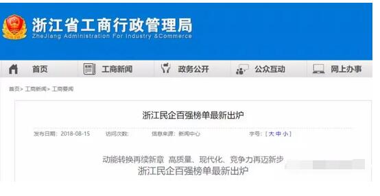 8月15日,浙江省工商局、浙江省工商聯、浙江省民營企業發展聯合會根據2017年度企業年報相關數據,以企業年度營業收入為主要依據,參考企業凈資產、納稅額、凈利潤等指標排名,發布《2017年度浙江省民營企業百強榜單》。