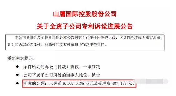 8月17日,山鷹紙業發布公告,對山東世紀陽光紙業起訴浙江山鷹紙業、壽光順發經貿、宇陽經貿侵害發明專利權糾紛案的一審民事判決予以說明。根據判決,浙江山鷹需向世紀陽光賠償6165.0435萬元,并立即停止侵害涉案發明專利權。 據了解,這場發明專利權糾紛案起于2012年6月26日,當時世紀陽光索求賠償款100.00萬元。幾年過去,案件仍未結束,2018年1月16日,世紀陽光將訴訟請求的賠償部分變更要求為賠償人民幣1億元。 根據“賠償6165.0435萬元”的判決結果,山鷹紙業表示,本案目前系一審判決,判決結果未生效,故一審判決結果并不會對公司目前正常業務開展產生影響,浙江山鷹將在上訴期限內啟動上訴程序。