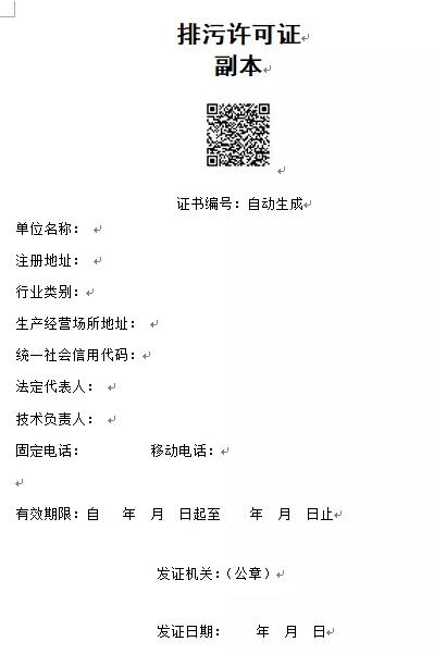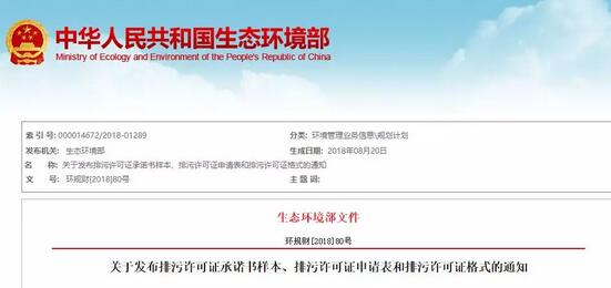 關于發布排污許可證承諾書樣本、排污許可證申請表和排污許可證格式的通知 各省、自治區、直轄市環境保護廳(局),新疆生產建設兵團環境保護局: 依據《排污許可管理辦法(試行)》,我部組織制定了排污許可證承諾書(樣本)、排污許可證申請表(試行)及排污許可證格式(具體見附件1-3)。現印發給你們,請遵照執行。 本通知發布后,《關于印發〈排污許可證管理暫行規定〉的通知》(環水體〔2016〕186號)廢止。 附件:1.承諾書(樣本) 2.排污許可證申請表(試行) 3.排污許可證格式 生態環境部 2018年8月17日 抄送:機關各部門,環境工程評估中心。 生態環境部辦公廳2018年8月20日印發 證書樣本: 正本: 1、ZHB標志改成MEE標志 2、監制單位也由環境保護部改成生態環境部