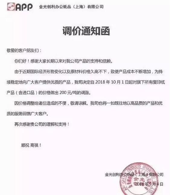 旺季來臨,各紙種價格上漲成了普遍現象! 9月1日起,全國部分文化紙企業掀起了新一輪調價潮。事實上,從8月22日到8月31日的10天內,近30家紙廠已經發布漲價函,漲幅為200-300元/噸。 受此影響,終端紙類文具已經調價。和上半年相比,作業本、筆記本等紙類文具用品出現了10%-20%的上漲。 經濟導報記者在調查中了解到,成品紙價格上漲的主要因素是受原材料價格上漲、匯率變化影響。受訪人士認為,短期內,隨著市場步入旺季,供需關系發生變化,加上外廢進口進一步趨嚴,木漿加征關稅,導致紙企提高紙價。 一、央視聚焦紙價上漲,只因漲價函頻繁現身 造紙行業2018年上半年整體維持了高景氣度,各紙種價格上漲了10-15%,而原材料廢紙、闊葉漿、針葉漿價格分別同比上漲69%、31%、40%。近期,央視再度關注紙價上漲,將行業推向了風口浪尖。 據報道,隨著原材料價格的上漲,疊加需求旺季等因素,龍頭紙企的漲價函更不含糊。 APP,自10月1日起,所有復印紙產品(含進口品)價格上調200元/噸。