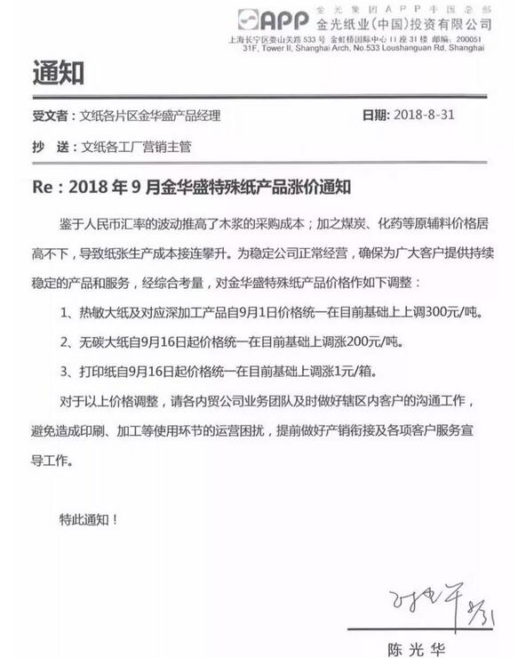 APP,自9月1日起,熱敏大紙上調300元/噸;自9月16日起,無碳大紙上調200元/噸;打印紙,上調1元/箱。
