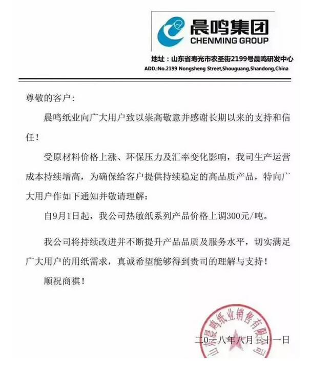 晨鳴集團,自9月1日起,熱敏紙產品價格上調300元/噸。