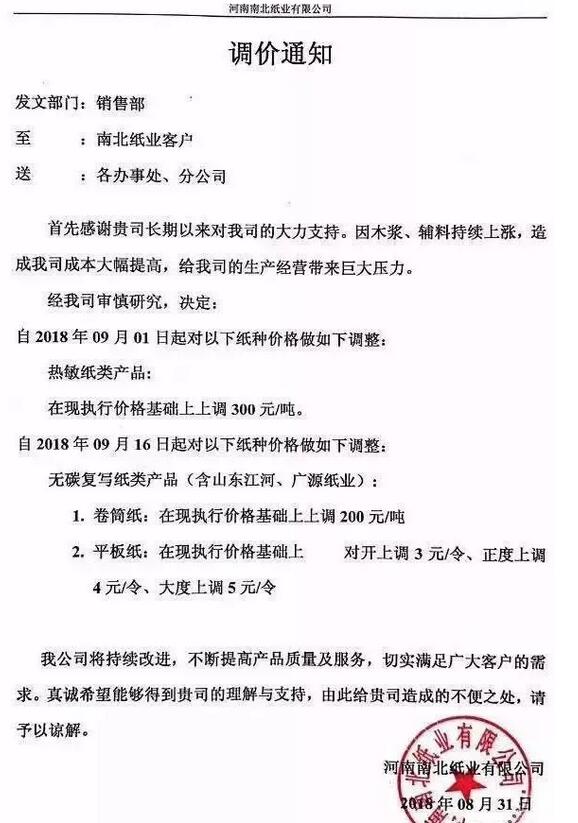 南北紙業,自9月1日起,熱敏紙產品價格上調300元/噸。自9月16日起,無碳復寫紙產品,卷筒價格上調200元/噸,平板對開上調3元/令、正度上調4元/令、大度上調5元/令。