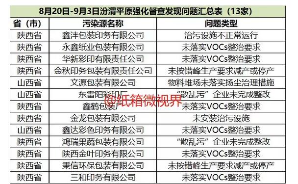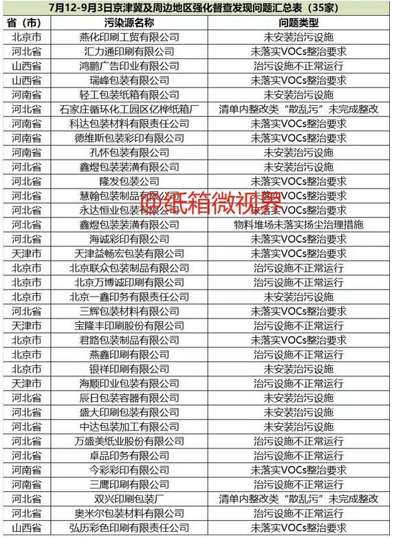 2018-2019年藍天保衛(wèi)戰(zhàn)重點區(qū)域強化督查工作繼續(xù)開展,200個督查組對京津冀及周邊地區(qū)的219個縣(市、區(qū))進行督查,90個督查組對汾渭平原的94個縣(市、區(qū))進行督查,7月底至9月初,共發(fā)現(xiàn)問題包裝印刷企業(yè)40多家。 京津冀及周邊35家包裝印刷企業(yè)被環(huán)保部曝光 理發(fā)現(xiàn),7月12日至9月3日,不到兩個月時間,環(huán)保督察組在對京津冀及周邊地區(qū)督查過程中,發(fā)現(xiàn)問題包裝印刷企業(yè)35家,這些企業(yè)的環(huán)保問題主要包括:未安裝污染設(shè)施、未落實VOCs整治要求、治污設(shè)施不正常運行、清單內(nèi)整改類“散亂污”未完成整改、物料堆場未落實揚塵治理措施。 汾渭平原13家包裝印刷企業(yè)被曝光 藍天保衛(wèi)戰(zhàn)第二輪環(huán)保督查于8月20日啟動強化督查,督查范圍涉及汾渭平原、2+26城市以及長三角部分城市。自8月20日至9月5日,汾渭平原地區(qū)揪出問題包裝印刷企業(yè)13家。 13家企業(yè)存在環(huán)保問題主要包括:未安裝污染設(shè)施、未落實VOCs整治要求、未按錯峰生產(chǎn)要求減產(chǎn)或停產(chǎn)、治污設(shè)施不正常運行、“散亂污”未完成整改、物料堆場未落實揚塵治理措施。