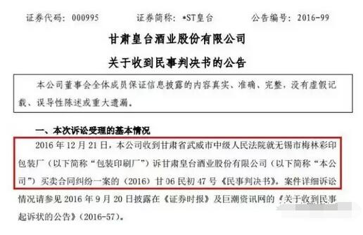 眾所周知,紙包裝企業由于各方面成本上漲,再加上大環境形勢不好,利潤微薄。許多中小型紙箱廠辛辛苦苦一年下來,凈利潤恐怕只有幾百萬,甚至幾十萬。而客戶如果拖欠貨款,在這個現金為王的時代,企業經營無異于雪上加霜。 上市酒企拖欠千萬貨款,華東一包裝廠采取法律手段 可能有人會認為,大型企業實力強,很難發生此類行為?蓪嶋H上,卻并非如此。2016年12月24日,甘肅皇臺酒業股份有限公司收到甘肅省武威市中級人民法院就無錫市梅林彩印包裝廠訴皇臺酒業買賣合同糾紛一案的《民事判決書》。