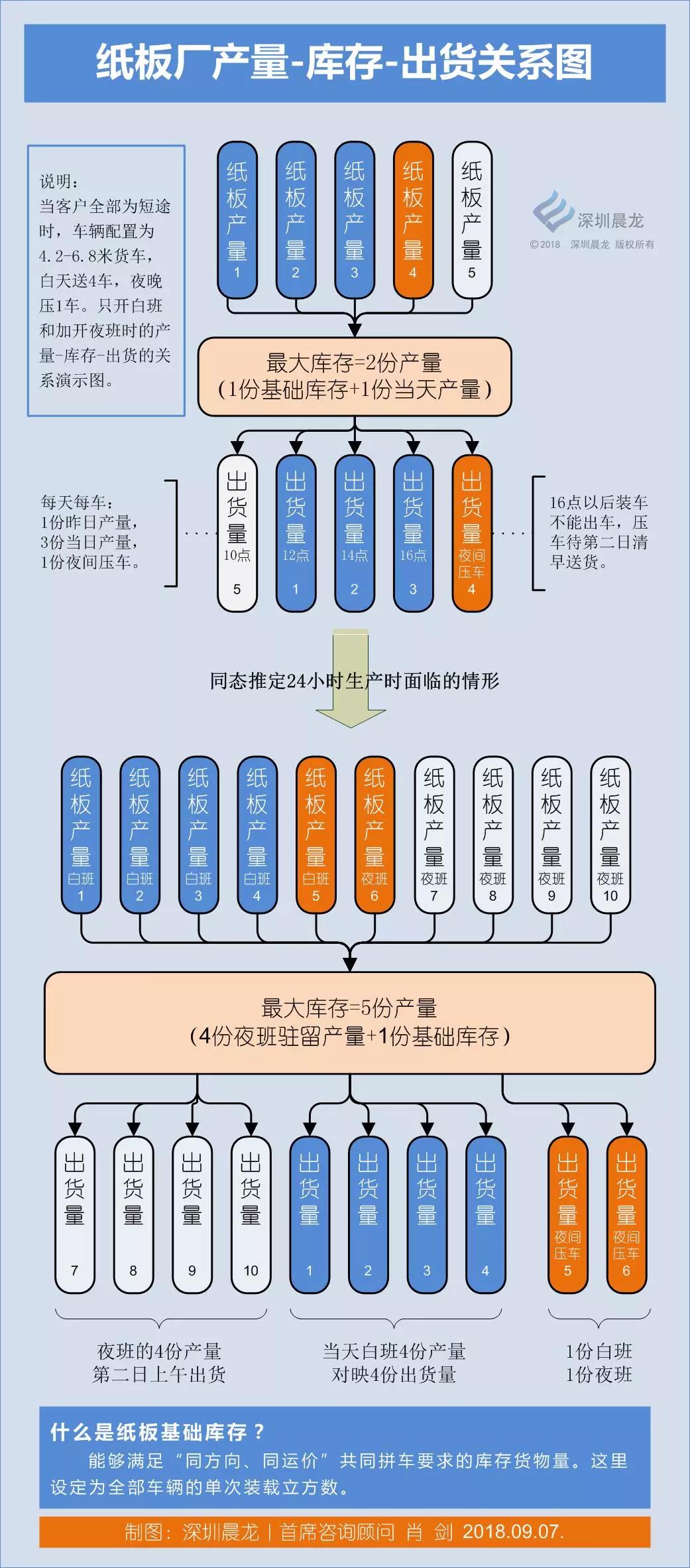 東莞作為中國二級紙板廠發展最充分的區域,積累了大量的實踐經驗。紙板廠在整廠效率的發揮、挖掘力度,在全國肯定是位居首位。在東莞,紙板廠滿負荷運行的工廠很多,卻極少聽到哪家廠會經常爆倉的。 相比于非珠三角區域,紙板廠只要產量提升一個臺階,就遇一次爆倉。出貨環節,往往成為提升公司經營業績的“瓶頸”。 東莞紙板廠的模式發跡于2000年之后,當時的紙品廠開始嘗試獨立紙板廠的運作,是踏著艱辛的步伐一步步發展過來的。其間經歷了倉庫管理、車輛管理、運作模式管理等創新,狠抓出貨效率,從而實現24小時高效運作的管理成果。 自從筆者走訪了潮州MF紙板廠,才拓展了對出貨效率制約因素的認知—— MF紙板廠,客戶群體集中,絕大多數客戶是20公里范圍。兩條瓦線白天全負荷生產,平均機速已達140米,生產效率發揮充分。老板多年以來的愿望,就是希望加開夜班,實現經營業績的倍增。但苦于倉庫爆倉,多年來無法突破。 經深入交流,筆者發現MF紙板廠因客戶群體較為集中,反而帶來如下制約: 1、客戶全部在20公里范圍內,送貨服務必須敏捷快速; 2、短途運輸、道路狹窄,車輛全部是4.2米、6.8米車; 3、因為客戶離得近,又有同業競爭,于是遷就客戶要求,午休時間及18點下班以后,客戶均不收貨; 4、送貨車輛小型化,貨物周轉較快,每臺車每天白天可送貨4次,夜間再裝1車第二天早上送。 上述市場條件,可總結為:提高產量與客戶收貨時間窗口之間的矛盾。從8點到18點,除去午休,每天只有8-9小時可收貨時間。如何解決24小時生產與8小時收貨之間的矛盾,成為MF紙板廠必須面對的突破口。 這也就是說——紙板客戶長途、短途占比,居然會影響一家紙板廠產能的發揮! 筆者為了說明這個問題,專門畫了一張紙板產量-庫存-出貨演示圖,如下: