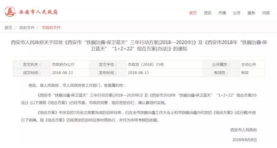 西安市 西安市人民政府印發《西安市“鐵腕治霾·保衛藍天”三年行動方案(2018—2020年)》及《西安市2018年“鐵腕治霾·保衛藍天”“1+2+22”組合方案(辦法)》。方案提出,禁止新建、擴建燃煤發電、燃煤熱電聯產和燃煤集中供熱項目,禁止新建、擴建和改建石油化工、煤化工、水泥、焦化項目。