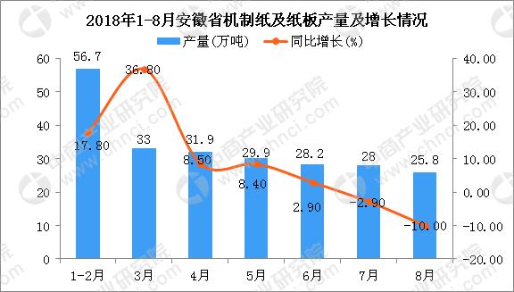 2018年1-8月安徽省機制紙及紙板產(chǎn)量及增長情況
