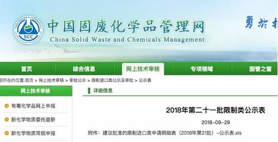 9月29日,中國固廢中心公布的2018年第21批限制進口許可證顯示,審核通過了玖龍紙業(天津)有限公司、浙江高陽紙業有限公司、山鷹國際控股有限公司、德彥紙業(廈門)有限公司、玖龍紙業(泉州)有限公司、聯盛紙業(龍海)有限公司、匯勝集團股份有限公司、萊州魯通特種紙業有限公司、棗莊華潤紙業有限公司、重慶理文造紙有限公司10家紙廠共獲核準總量為60.3844萬噸。