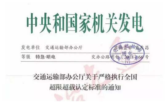 全國嚴格執行統一超限超載認定標準 9月19日,交通部發布通知,要求嚴格執行全國超載超限認定標準。特別強調了:部分地區依然未嚴格執行全國統一超限超載認定標準,部分高速公路對超限30%的車輛仍然按照基本費率計重收費,導致高速公路與普通公路治超標準不一致,不同省份執法力度不統一等問題。 未按標準執行的地區,9月底前全面整改,10月10日各地區將整改排查情況報部。