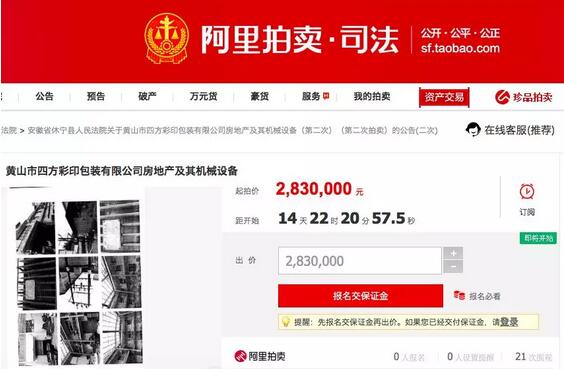 2018年10月24日至10月25日,安徽省休寧縣人民法院將對(duì)黃山市四方彩印包裝有限公司房地產(chǎn)及其機(jī)械設(shè)備進(jìn)行公開拍賣,起拍價(jià)283萬(wàn)元。