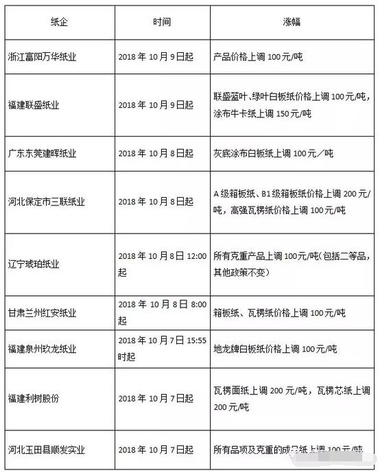 (部分漲價的紙廠) 瓦楞紙、箱板紙、白板紙、牛皮紙,四季度行情怎么走? 可盡管如此,對于紙價中長期走勢,大多數業內人士卻并不看好。他們認為,受原料和需求的影響,包裝紙行業的效益增長在短期內已經見頂。 第四季度瓦楞及箱板紙行情預測 進入四季度以后,預計瓦楞及箱板紙市場將呈現先降后穩中小幅上行走勢,上漲金額或僅在100-200元/噸。10月份停機檢修紙企較多,屆時在一定程度上也將緩解瓦楞及箱板紙市場供應壓力。 市場需求在雙十一、圣誕及元旦等節日帶動下較三季度有所改善,然考慮到國內經濟下行壓力加大及出口貿易導致包裝用紙需求萎縮等因素影響,整體市場行情難言樂觀。 第四季度白板紙行情預測 預計四季度白板紙市場供應狀況變化不大,而客戶對需求普遍預期較低,恐難出現“忙碌”景象,加之廢紙跌勢加重,白板紙價格下降風險較大。 10月份白板紙價格已普遍下調100-200元/噸,并且部分紙廠延遲開機時間。年底在紙廠減產及春節需求支撐下白板紙跌勢或趨緩,而后期隨著淡季來臨,紙廠產銷壓力繼續增加,價格難穩。 第四季度牛皮紙市場后市預測 國慶假期前后紙企出貨速度一般,下游需求面在傳統旺季無良好改善,故短期需求對牛皮紙市場的支撐力度不大,在11、12月份時因電商節或有小幅度的改善;上游各木漿漿種在第四季度或呈區間整理或弱穩走勢。 因此,第四季度成本對于牛皮紙市場亦無明顯支撐,故預計牛皮紙市場走高可能不大。 此外,山鷹紙業日前了發布了前三季度凈利潤預增財報,顯示其三季度的凈利潤不但比第二季度下降近50%,而且同比2017年第三季度的凈利潤下滑2%。像山鷹紙業這樣在上游既有原料優勢,在下游又有需求配套的企業,都出現了明顯的增長乏力。顯然,凜冬將至!
