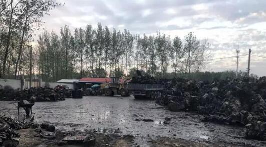 放眼望去,諾大的場地上,隨處堆放的報(bào)廢車零件,肆意傾倒的廢棄物油污,黑乎乎黏糊糊的令人觸目驚心,廠旁的一條小河里的河水也被染成了深黑色。