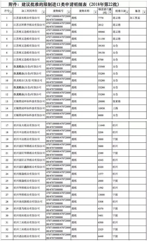 10月18日,固廢中心公布的2018年第22批限制進(jìn)口許可證公示,共通過47家企業(yè),核定進(jìn)口總量為201.2821萬噸。核定總量在目前年定公布批次中排名第三,核定工廠數(shù)量年內(nèi)最多,其中有紙廠是年內(nèi)首次拿到批文。其中玖龍紙業(yè)(東莞)有限公司此次拿到的批文數(shù)量最多達(dá)60.0257萬噸,占此次核發(fā)總量的29.82%;浙江地區(qū)核發(fā)工廠數(shù)量最多。