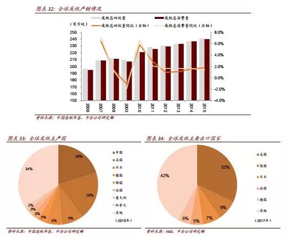 二、調研:國廢價格持續走冷,打包站出貨心理悲觀 9月末國廢價格大幅下調后,雖10月初價格有一定的回升,但是仍未達到之前的高點。為了了解現階段各打包站的出貨狀況,小編特地調研了一些打包站。 此次調研包括浙江、河南、江西、湖北、江蘇等地的一共13家打包站。其中月收貨量500噸以下的有7家,500噸至1000噸的有3家,1000噸以上的有3家。 出貨情況:在這13家打包站中,有11家基本沒有囤貨,有2家有一定的囤貨。但是面對現在變化不定的行情,所有的打包站無一例外選擇了快進快出。兩家有存貨的打包站也向小編表示之前不該囤貨,沒有及時出手。之前突然的價格崩盤讓打包站的經營者惶惶不可終日,在價格略有回升后,都選擇了拋貨即時止損。對于之后的行情走向,他們多是持悲觀態度,認為價格難以反彈。 綜上所述:按照以往的經驗,從業者會在價格上調時選擇囤貨。但是此次的價格跌幅超出想象,即使有不小的回升,仍未消除打包站經營者的恐慌心理。特別是近期利空消息層出不窮,從不斷升級的中美毛衣戰,到10月18日突然而至的第22批總計200萬噸的外廢批文。下游成品紙的市場情況本來就不甚理想,此次新增的200萬噸外廢更是成為壓死上游國廢價格的最后一根稻草。市場內憂外患,受到直接沖擊的打包站自然不敢再囤積居奇,縱使需要割肉拋貨,但是為了生存下去,別無選擇。近幾日的國廢價格仍有走低的趨勢,各打包站的冬天可能要提前來臨了。 北方昨日三大玖龍基地部分等級下調30-50,帶動周邊以河北為主的多數廠家普跌50。山東地區以德州、濰坊匯勝為主不少廠家下調50,市場補跌明顯。南方華東昨日基本維穩,浙江零星小廠調整自身,福建漳州山鷹上調50,其余廠家多維穩觀望。10月19日最高下調100元/噸,最高上調60元/噸,廢紙指數2211.27,環比下調0.36%。華東地區下調30-100元/噸,浙江有上調。華南地區下調30元/噸。 山東: 山東鄒城太陽宏河紙業,廢紙價格下調60元/噸,C級下調100元/噸。 山東聊城中治銀河紙業,廢紙價格下調50元/噸。 山東泰安泰和紙業,箱板紙價格下調40元/噸。 浙江: 浙江嘉興山鷹(吉安)紙業,白廢類上調60元/噸。 浙江嘉興景興紙業,辦公廢紙上調60元/噸。 浙江臺州森林紙業,廢紙價格下調50元/噸。 浙江臺州欣榮紙業,廢紙價格下調50元/噸。 福建: 福建泉州玖龍紙業,黃紙價格下調50元/噸(D級不變)。 福建漳州盈晟紙業,國廢下調50元/噸。 福建漳州三星紙業,廢紙價格下調50元/噸。 福建漳州港興紙業,廢紙價格下調50元/噸。 福建漳州聯盛紙業,黃板類下調30元/噸,白廢不變。 福建漳州華發紙業,廢紙價格下調50元/噸。 江蘇: 江蘇宿遷上善紙業,廢紙價格下調50元/噸。 廣東: 廣東東莞雙洲紙業,廢紙價格下調30元/噸。 三、數據說話:廢紙未來走勢,主基調穩中向上 因趨嚴的廢紙進口限制,國、內外廢紙價格分化,國產廢紙價格變動更多服從國內供需。預計2018~2020年我國進口量大幅下滑,回收量增長難以補足缺口,廢紙整體供給減少;同時我國廢紙消費已經穩定,增量有限。整體看,國產廢紙處于供不應求的局面,長期價格中樞穩中向上。 1.內外價格分化,國產廢紙價格服從國內供需 不同于紙漿(木漿+非木漿),近年來我國進口廢紙受到明顯的政策監管。其中,2017年7月中國正式向WTO發出通知,自2018年不再進口混雜廢紙;2018年3月中國將進口廢紙中混雜物比重標準從1.5%下調為0.5%,對進口廢紙質量要求再度提高,在進口政策的監管下,國內外廢紙價格開始出現分化。考慮未來中國收緊廢紙進口量是大概率事件,行業使用國產廢紙的比例將不斷提高,同時國內外廢紙價格分化持續,國產廢紙價格將更多考慮國內供需變動。  2.廢紙進口持續收緊,國產廢紙增量有限 根據中國造紙年鑒數據,2015年全球廢紙總回收量2.41億噸,同比增長1.8%,且近年來回收量同比增速較穩定。 中國、美國是全球前兩大廢紙生產國,產量占比均為20%,這主要源于兩國造紙產量高,廢紙來源多。從貿易格局看,美國是最大的廢紙出口國,美國出口量占全球總出口量比高達32%,同時日本、歐洲也是重要的廢紙出口地。相比下,中國廢紙消耗量大于產量,廢紙自用尚不足,不具備出口能力。  2017年中國廢紙回收量約5,000噸,同比增長0.7%。雖近年來國產廢紙回收量持續提升,但仍難滿足自用,廢紙自給率僅為63.8%。廢紙回收率較低是國產廢紙供不應求的重要原因,我國廢紙回收率僅為47%,明顯低于美、日、歐等地60%以上的廢紙回收率水平。 而回收率差距的核心原因在于我國廢紙回收體系尚不健全,存在網絡不夠全面、行業集中度低且中小企業經營能力差、行業缺乏統一標準等諸多問題。向前看,我們預計未來我國回收率仍有廣闊提升空間,其一在于受益于政策傾斜,我國廢紙回收體系將繼續完善,根據《再生資源回收體系建設中長期規劃(2015年~2020年)》及《關于推進再生資源回收行業轉型升級的意見》,預計2020年我國廢紙回收量提升至5500萬噸,對應回收率50%;其二考慮當前國產廢紙價格同比升高,廢紙回收行業的盈利水平因此提高,也將刺激廢紙回收業的發展。