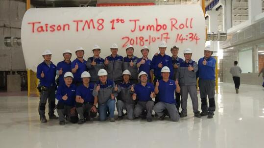 2018年10月17日14點34分,第一卷衛生紙在江西泰盛TM8號機上正式卷出,標志著TM8號機成功投產。同時,TM8號機打破之前福伊特創造的衛生紙機開機紀錄,實現開機時間的突破-從上漿到出紙,僅用15分鐘。并且自第一卷從母輥上生產出來的衛生紙即為可供銷售的合格產品。再一次,福伊特XcelLine智能紙機展示了卓越的表現,實現紙機的快速開機、迅速投產。