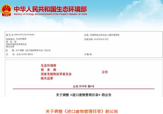 為進一步規(guī)范固體廢物進口管理,防治環(huán)境污染,根據(jù)《中華人民共和國固體廢物污染環(huán)境防治法》《固體廢物進口管理辦法》及有關(guān)法律法規(guī),生態(tài)環(huán)境部、商務(wù)部、發(fā)展改革委、海關(guān)總署對現(xiàn)行的《限制進口類可用作原料的固體廢物目錄》《非限制進口類可用作原料的固體廢物目錄》和《禁止進口固體廢物目錄》進行以下調(diào)整: 一、將廢五金類、廢船、廢汽車壓件、冶煉渣、工業(yè)來源廢塑料等16個品種固體廢物(見附件1),從《限制進口類可用作原料的固體廢物目錄》調(diào)入《禁止進口固體廢物目錄》,自2018年12月31日起執(zhí)行。 二、將不銹鋼廢碎料、鈦廢碎料、木廢碎料等16個品種固體廢物(見附件2),從《限制進口類可用作原料的固體廢物目錄》《非限制進口類可用作原料的固體廢物目錄》調(diào)入《禁止進口固體廢物目錄》,自2019年12月31日起執(zhí)行。 《進口廢物管理目錄》(環(huán)境保護部、商務(wù)部、發(fā)展改革委、海關(guān)總署、質(zhì)檢總局2017年第39號公告)所附目錄與本公告不一致的,以本公告為準(zhǔn)。 特此公告。 附件:1.2018年年底調(diào)整為禁止進口的固體廢物目錄 2.2019年年底調(diào)整為禁止進口的固體廢物目錄 生態(tài)環(huán)境部 商務(wù)部 發(fā)展改革委 海關(guān)總署 2018年4月13日 附件1.>2018年年底調(diào)整為禁止進口的固體廢物目錄