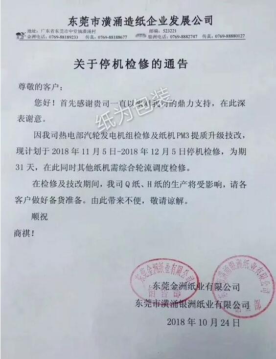 10月24日,東莞金洲、銀洲紙業(yè)發(fā)出停機(jī)檢修通告,11月5日~12月5日停機(jī)檢修31天。不久前,泉州玖龍也發(fā)出了對35#、36#紙機(jī)11月10日-22日停機(jī)檢修13天的公告。紙企旺季紛紛停機(jī)或是為了保住成品紙價(jià)格,降低庫存,同時(shí)借此打壓國內(nèi)廢紙價(jià)格,讓自己和市場都喘口氣。 金洲、銀洲紙業(yè)發(fā)布公告,11月5日~12月5日停機(jī)檢修31天 10月24日,東莞金洲紙業(yè)有限公司、東莞市潢涌銀洲紙業(yè)有限公司發(fā)出停機(jī)檢修通告: 因熱電部汽輪發(fā)電機(jī)組檢修及紙機(jī)PM3提質(zhì)升級(jí)技改,現(xiàn)計(jì)劃于2018年11月5日~2018年12月5日停機(jī)檢修,為期31天,在此同時(shí)其他紙機(jī)需綜合輪流調(diào)試檢修。 在檢修及技改期間,我司Q紙、H紙的生產(chǎn)將受到影響,請各客戶做好備貨準(zhǔn)備。